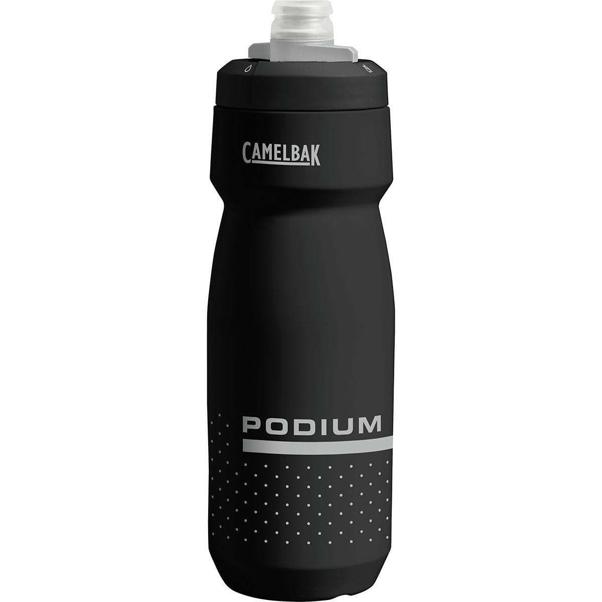 The CamelBak Podium 24oz Bike Bottle is a BPA-, BPS-, and BPF-free water bottle for bike rides. The 24 ounce size is plenty for a morning, evening, or midday ride, and hydration is important for performance, so ride hard and sip away. The self-sealing cap prevents spills, while an on/off valve offers leakproof transport.