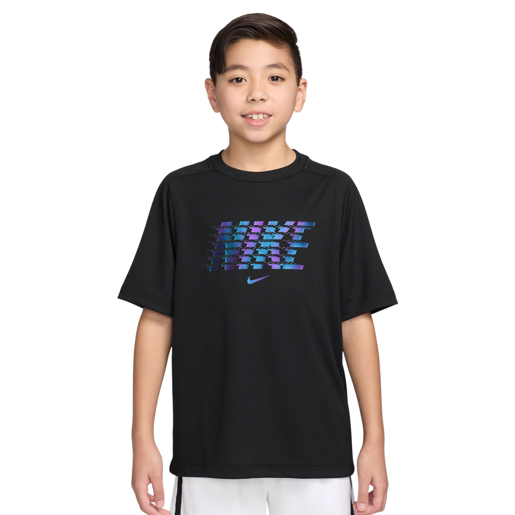 Introducing the Nike Multi Bold Dri-FIT T-Shirt for kids, designed to keep young athletes dry and comfortable as they conquer their day. This shirt is perfect for those high-energy soccer games or after-school track practices. The key feature, Nike's Dri-FIT technology, actively moves sweat away from the body. Paired with an easy fit that's just right - not too big, not too small - it ensures maximum comfort and mobility.
