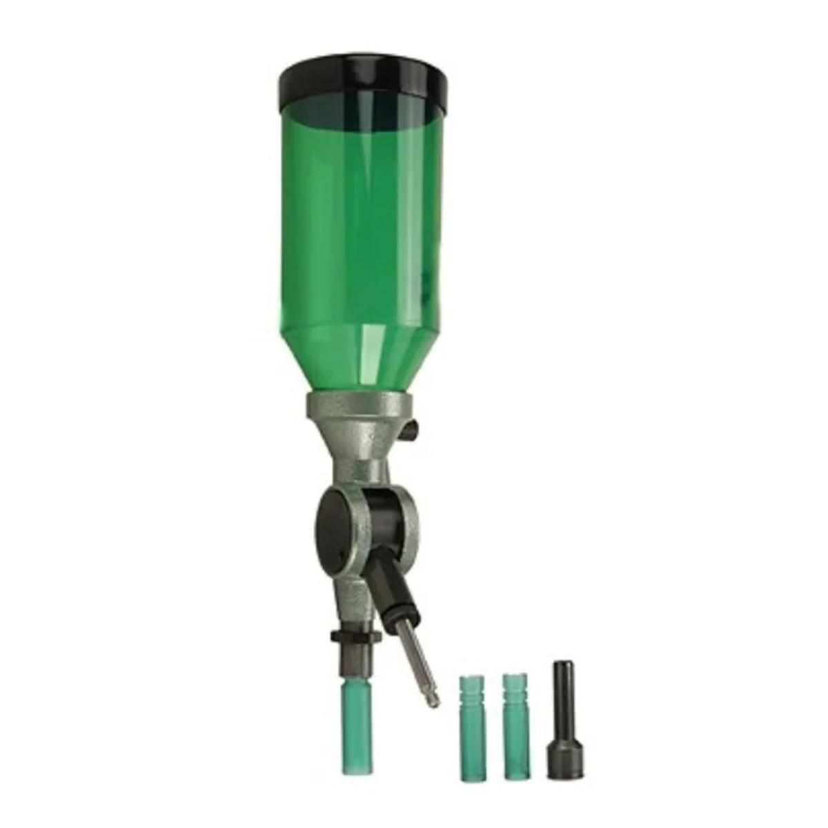 The RCBS Quick Change High Capacity Powder Measure can dispense large rifle charges of up to 250 grains of smokeless powder. The large hopper can accommodate 2 pounds of smokeless powder, and metering assemblies change out with the pull of a pin. Extra metering assemblies can be purchased to preset for favorite charges. The drain attachment empties the powder hopper without the need to remove it from the stand or press. The unit includes one metering assembly, .22-.270 Drop tube, .30-.45 Drop Tube, .50 Drop Tube and the Quick Change High Capacity Drain Attachment. Note: Do NOT use with black powder. The Powder Measure should be used in conjunction with an accurate powder scale for setting the original charge and for checking charges occasionally during the run.