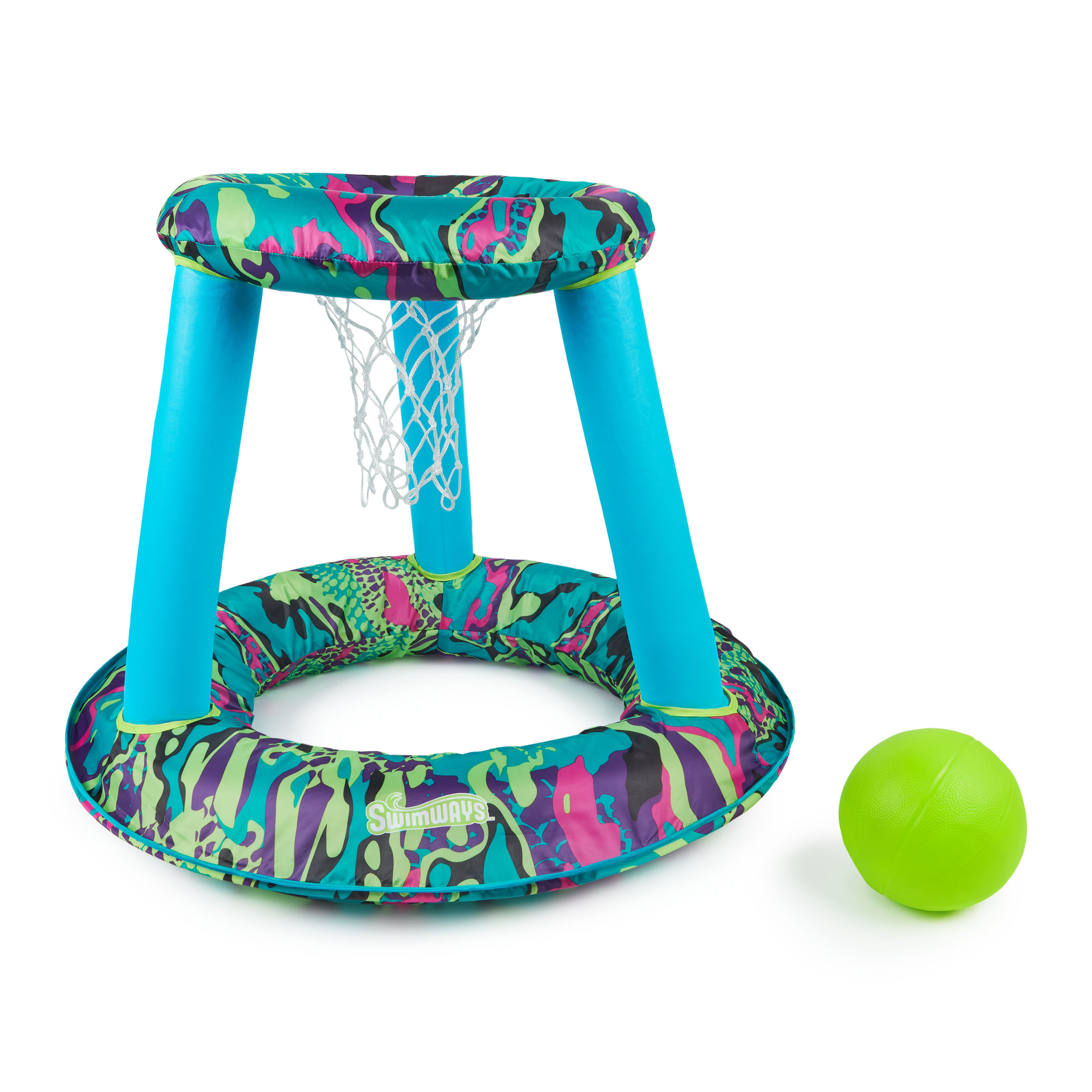 The SwimWays Hydro Spring Hoops is a floating basketball game set for the swimming pool! The floating net opens for instant action and easily closes for storage thanks to an inner spring in the base of the basket. The fabric covering on the goal features a brightly colored pattern that kids and teens love. This fabric cover also adds durability to the inflation chambers. Each basketball set includes an inflatable basketball with a textured grip for non-slip performance. Great for pool parties, endless summer days, and vacations. Folds flat and compact into three circles – it’s the perfect swimming pool game for travel! Includes one floating net and one ball per set. Carry/storage bag included.